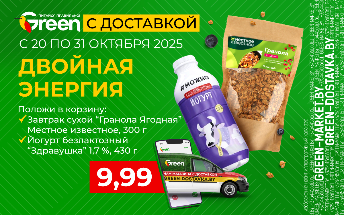 С 20 по 31 октября в green-dostavka! Положите в корзину: Завтрак сухой Гранола Ягодная Местное известное, 300 г Йогурт безлактозный Здравушка 1,7%, 430 г