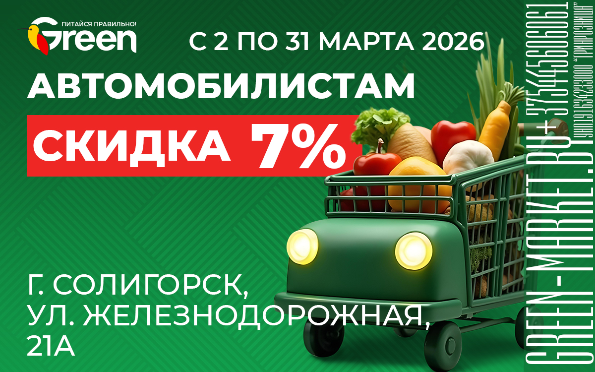 ТОЛЬКО в магазине 🍃GREEN по адресу: г. Солигорск, ул. Железнодорожная, 21А. с 2 по 31 марта 2026 года дарим скидку 7% для 🚙автомобилистов