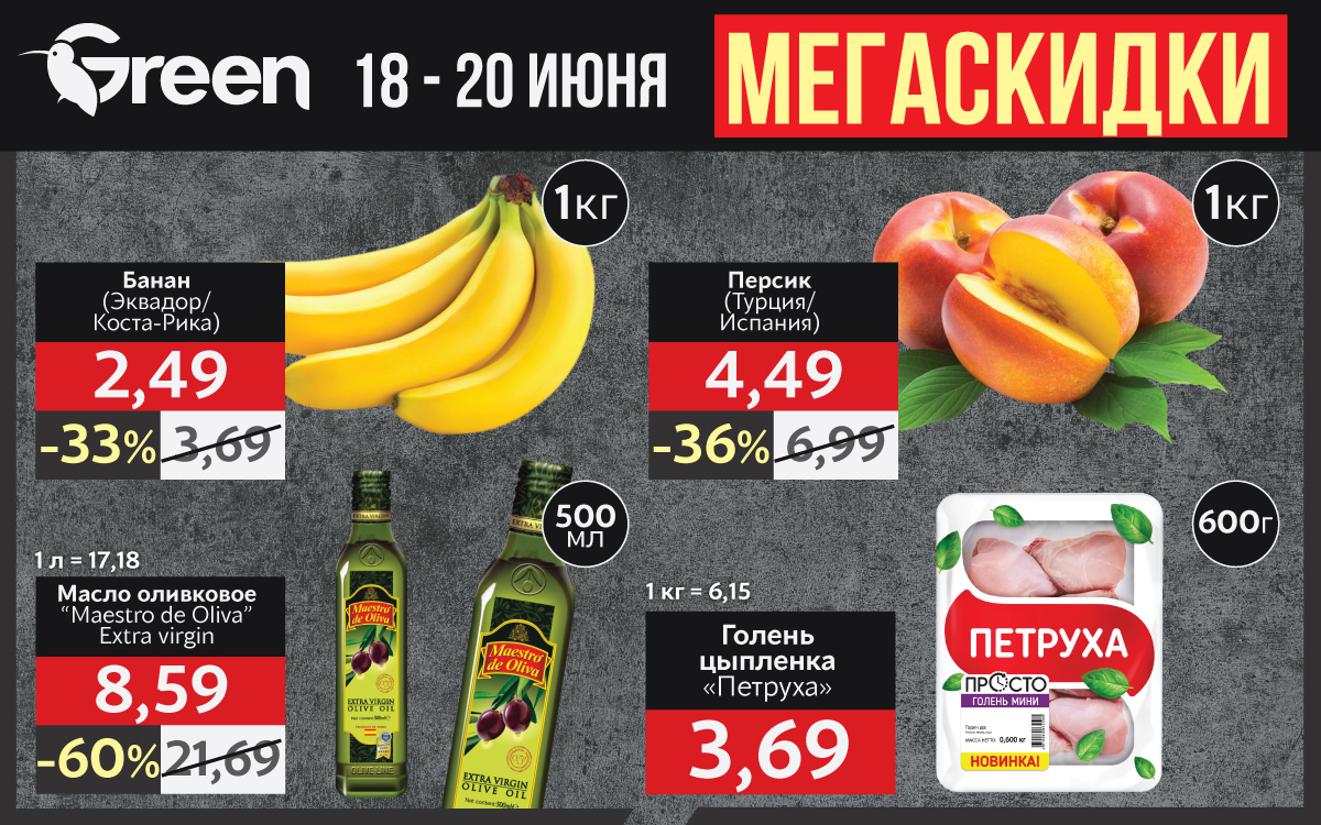 *скидка распространяется при наличии бонусной карты GREEN, максимальная сумма скидки на акционные позиции составляет 25 рублей в день на карту GREEN. Предложение ограничено, подробности акции уточняйте на инфоцентре.