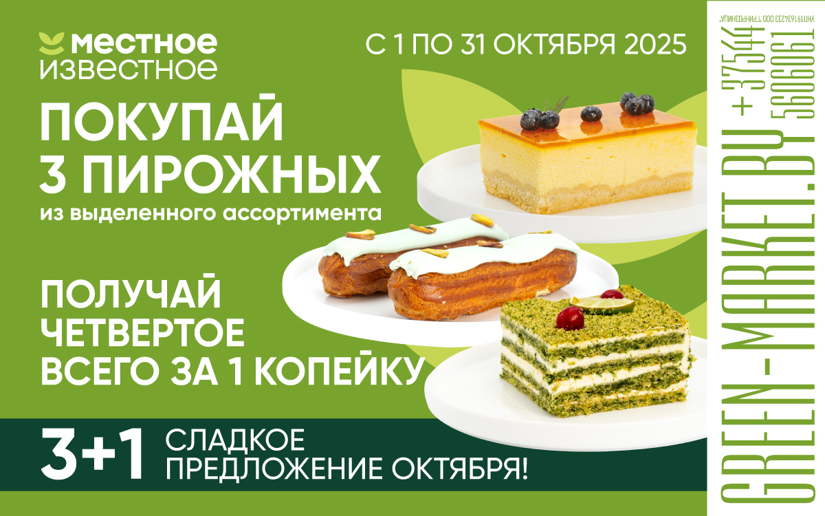 С 1 по 31 октября покупайте 3 пирожных и получайте четвёртое всего за 1 копейку! Это отличная возможность побаловать себя и близких любимыми десертами.