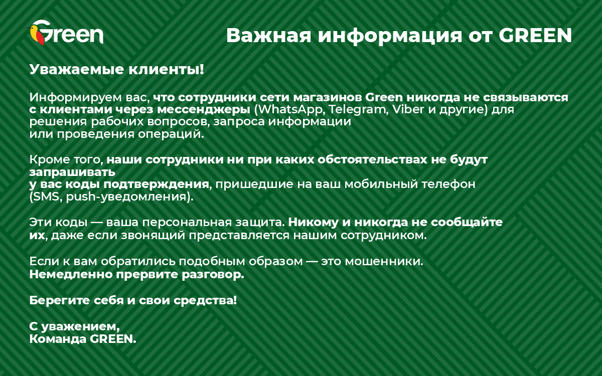 Информируем вас, что сотрудники сети магазинов Green никогда не связываются с клиентами через мессенджеры (WhatsApp, Telegram, Viber и другие) для решения рабочих вопросов, запроса информации или проведения операций.