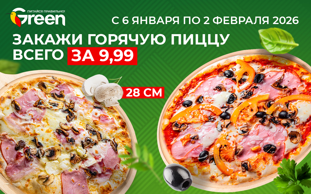 С 6 января по 2 февраля 2026 г. заказывайте любую пиццу собственного производства диаметром 28 см всего за 9,99 в магазинах Green в г. Бресте и г. Полоцке!