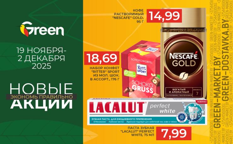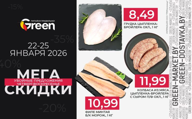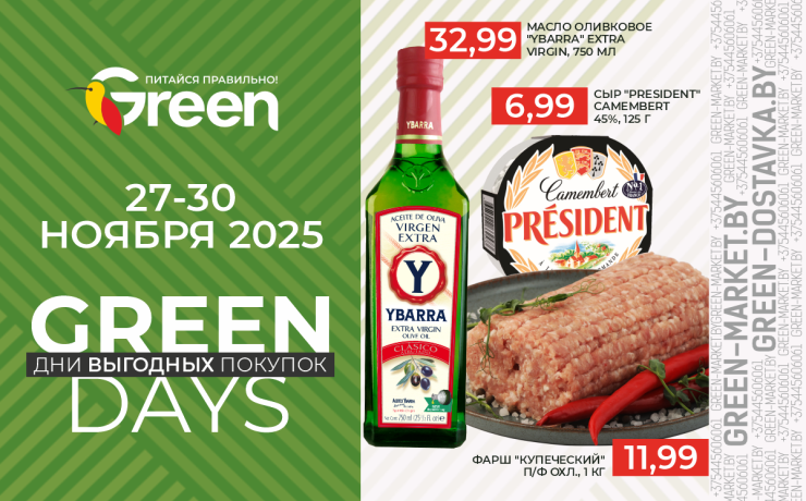 Скидка предоставляется на кассе и не суммируется с другими акциями. Количество акционного товара ограничено. Действие акции не распространяется в магазинах Green г.Минск, ул. Туровского, 24; г. Борисов, ул. Гагарина, 62, г. Гомель, ул. Мазурова, 1, а также сервисе доставки green-dostavka.by.